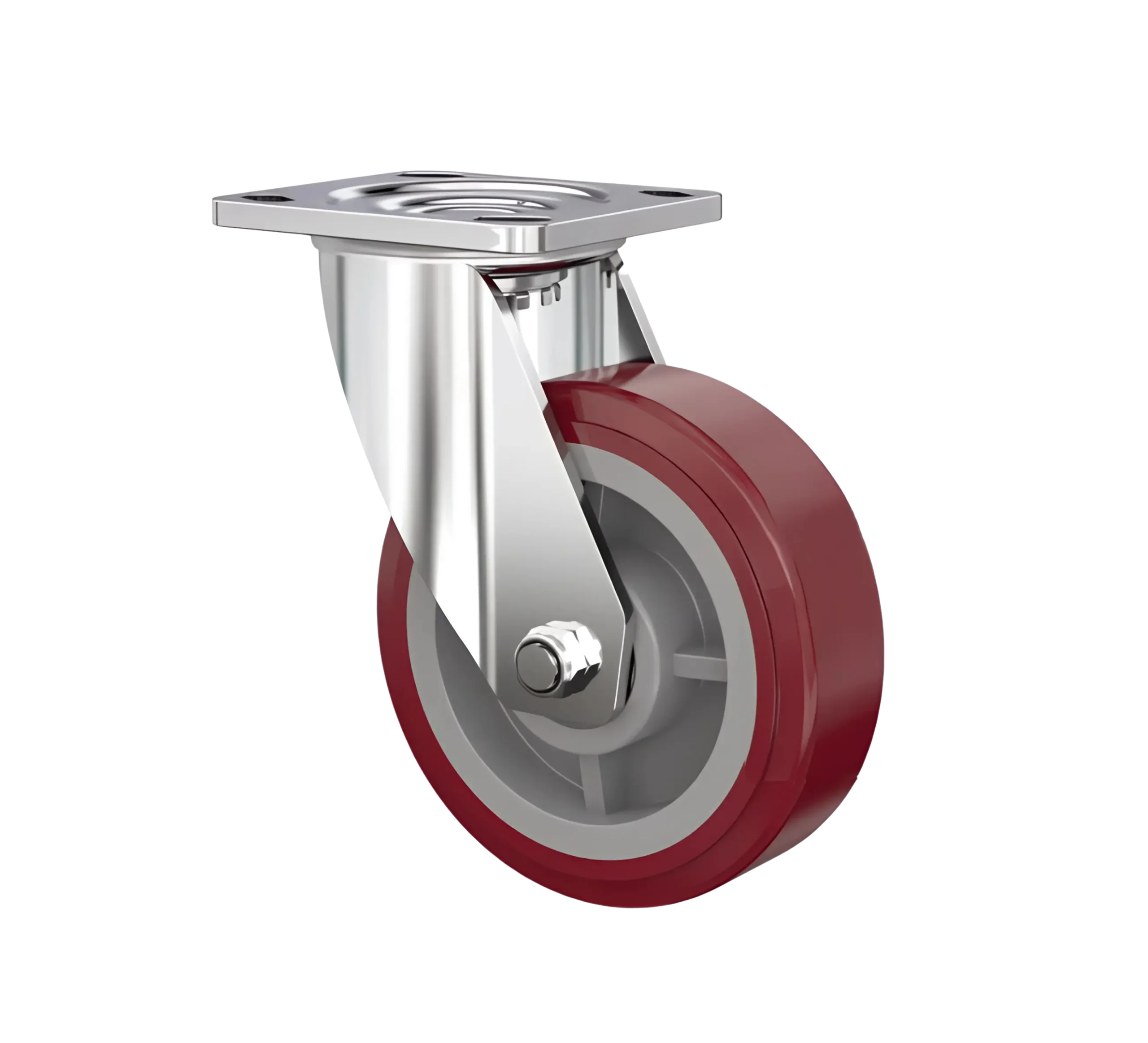 La Rueda STRONG Banda PU Núcleo PP (Polipropileno), 150 mm con Placa Giratoria Inox 304, se fabrica a partir de una Banda de Poliuretano de color Rojo inyectado. El Núcleo se compone de un molde inyectado con PP (Polipropileno), de color Gris. Para mejorar el desplazamiento, la rueda dispone de Doble Rodamiento de Bolas de Acero en el Eje. La Placa Giratoria es fabricada en Acero Inoxidable 304 de Grado Alimentario, Formado por Placas Laterales soldadas a la Base de Montaje. El espesor de la Chapa de Acero Inoxidable es de 4 mm. La Rueda STRONG Banda PU Núcleo PP (Polipropileno), con Placa Giratoria Inox 304, tiene un Diámetro Rueda 150 mm, Capacidad de Carga 350 Kg.