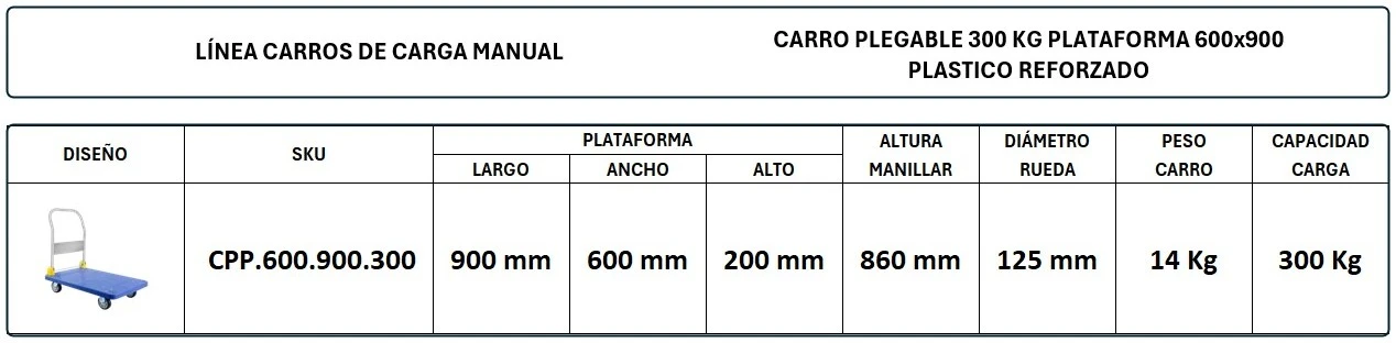 El Carro Plegable 300 Kg Plataforma en Plástico Reforzado con Dimensiones 600×900 mm, están fabricados en base a estructura monobloque en Plástico Polipropileno (PP) Reforzado, con un Manillar Plegable y Auto-Lock, armado de tubo de acero de 20 mm de diámetro y 2 mm de espesor. El carro se complementa con cuatro (4) ruedas de Banda en Goma TPR y Núcleo en Plástico PP, de 125 mm de diámetro y capacidad de carga de 120 Kg cada una. Terminación en Color Azul.