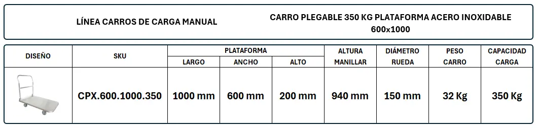 Carro Plegable 350 Kg Plataforma Acero Inoxidable 600×1000