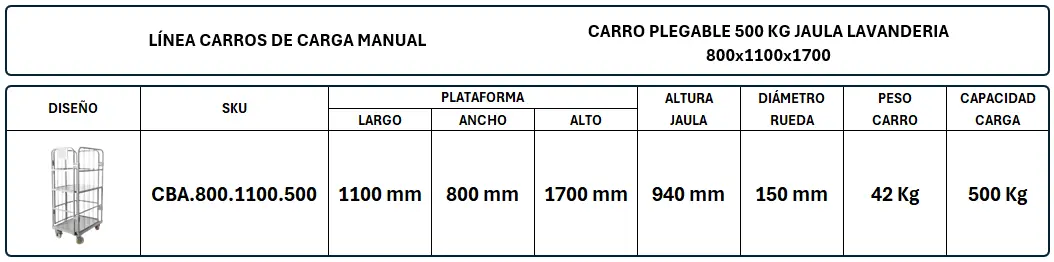 El Carro Plegable 500 Kg Jaula Lavandería 800x1100x1700, con Capacidad de Carga hasta 500 Kg, está fabricado en base a una estructura de perfiles tubular de acero reforzado de 2 mm de espesor, soldados con proceso MIG. La Jaula del Carro está Formada por Barandas en estructura hecha de un armazón de perfiles tubulares de acero y malla metálica. El carro se complementa con cuatro (4) ruedas de Banda en Poliuretano y Núcleo en Plástico PP, de 150 mm de diámetro y capacidad de carga de 300 Kg cada una. La Jaula tiene acceso por medio de una Puerta Doble, con Bisagras Dobles y Sistema de Cierre por Picaporte. La Altura de la Jaula es de 1700 mm, las dimensiones de la Plataforma son de 800×1100 mm.