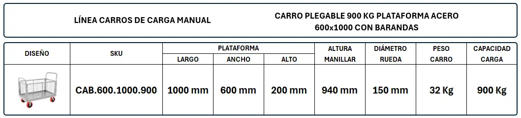 Carro Plegable 900 Kg Plataforma Acero 600×1000 con Barandas