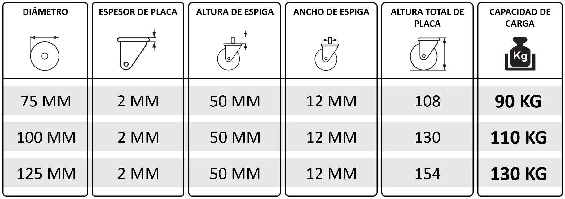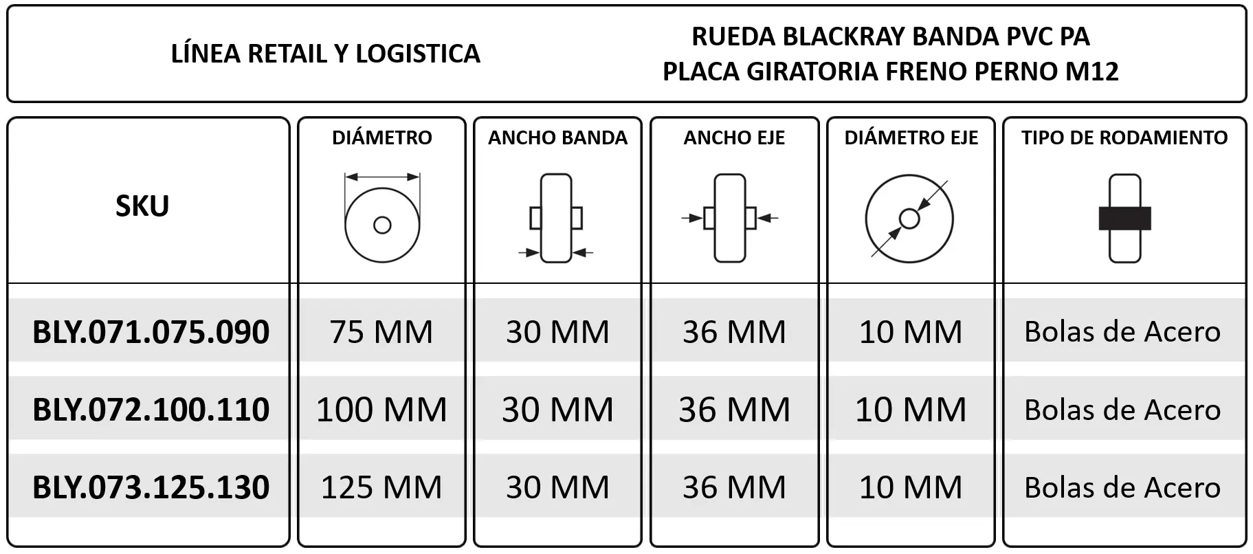 Estas ruedas están indicadas para carros con cargas ligeras a bajas, de uso en ambiente interno. La Banda de PVC la convierte en una rueda apta para pisos duros y para ambientes institucionales, en los que se requiera una rodadura firme. Apto para las siguientes aplicaciones: Carros Supermercado y la Industria del Retail, Carros para uso en Pisos de Cerámica, Carros para Pequeños Mostradores y Anaqueles, Carros para Equipamiento Médico. Uso en Ambiente Institucional como Oficinas, Colegios, Hospitales, Laboratorios.