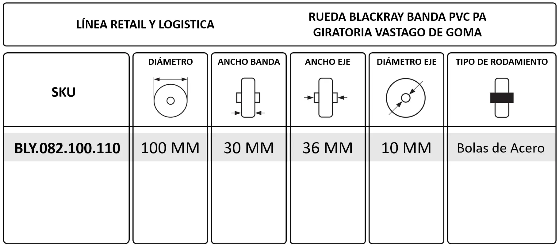 La Rueda BLACKRAY Banda PVC PA Giratoria Vástago Goma, está fabricada a partir de una Banda de Termoplástico Sintético PVC color Negro, la cual va montada sobre un Núcleo de Polímero Termoplástico (Poliamida PA) de color Negro. Para una Rodadura suave, la rueda cuenta con Doble Rodamiento de Bolas de Acero. La Placa Giratoria está fabricada a partir de chapa de Acero estampado en prensa, espesor de 2 mm. Complementa el Sistema de Fijación por un Perno M12 de 60 mm de Longitud, y un Vástago de Goma de 28 mm de Diámetro. La Terminación es Electro Pintada en Color Negro,