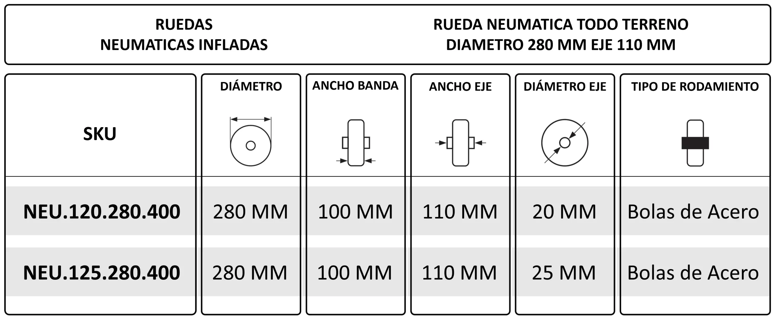 La Rueda Neumática Todo Terreno Diámetro 280 mm Eje 110 mm, está formada por una Banda de Caucho Natural de 6 telas, con un perfil de dibujo apto para Todo Terreno. Neumático de tipo Tubular. El núcleo de la Rueda está formado por dos chapas metálicas prensadas y unidas por medio de soldadura MIG. Esta Rueda presenta una rodadura suave y silenciosa gracias al uso de Doble Rodamiento de Bolas de Acero en el Eje.